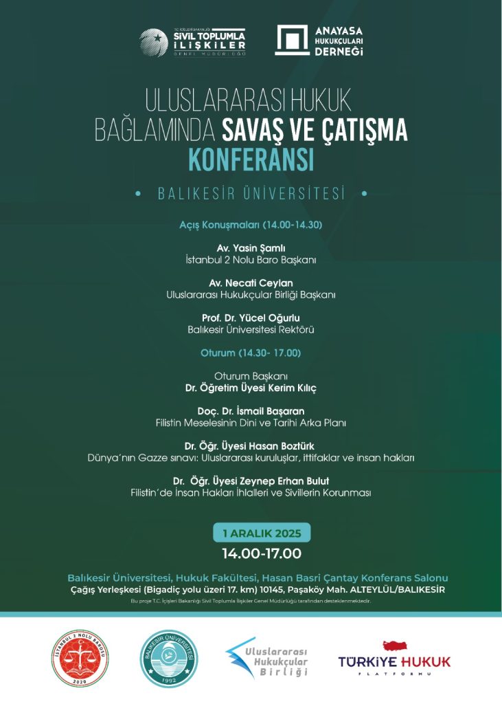 Anayasa Hukukçular Derneği tarafından Türkiye Hukuk Platformu, İstanbul 2 Nolu Barosu, Uluslararası Hukukçular Birliği (UHUB) ve Balıkesir Üniversitesi iş birliğiyle, uluslararası hukukun en güncel ve kritik konularından “savaş ve çatışma” başlığında önemli bir konferans düzenleniyor. İçişleri Bakanlığı Sivil Toplumla İlişkiler Genel Müdürlüğü tarafından desteklenen etkinlik, Filistin meselesini uluslararası hukukun farklı perspektiflerinden ele alacak.