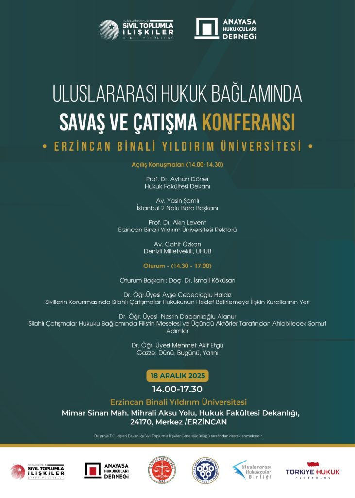 Anayasa Hukukçular Derneği tarafından Türkiye Hukuk Platformu, İstanbul 2 Nolu Barosu, Uluslararası Hukukçular Birliği (UHUB) ve Erzincan Binali Yıldırım Üniversitesi iş birliğiyle, uluslararası hukukun en güncel ve kritik konularından “savaş ve çatışma” başlığında önemli bir konferans düzenleniyor. İçişleri Bakanlığı Sivil Toplumla İlişkiler Genel Müdürlüğü tarafından desteklenen etkinlik, Filistin meselesini uluslararası hukukun farklı perspektiflerinden ele alacak.